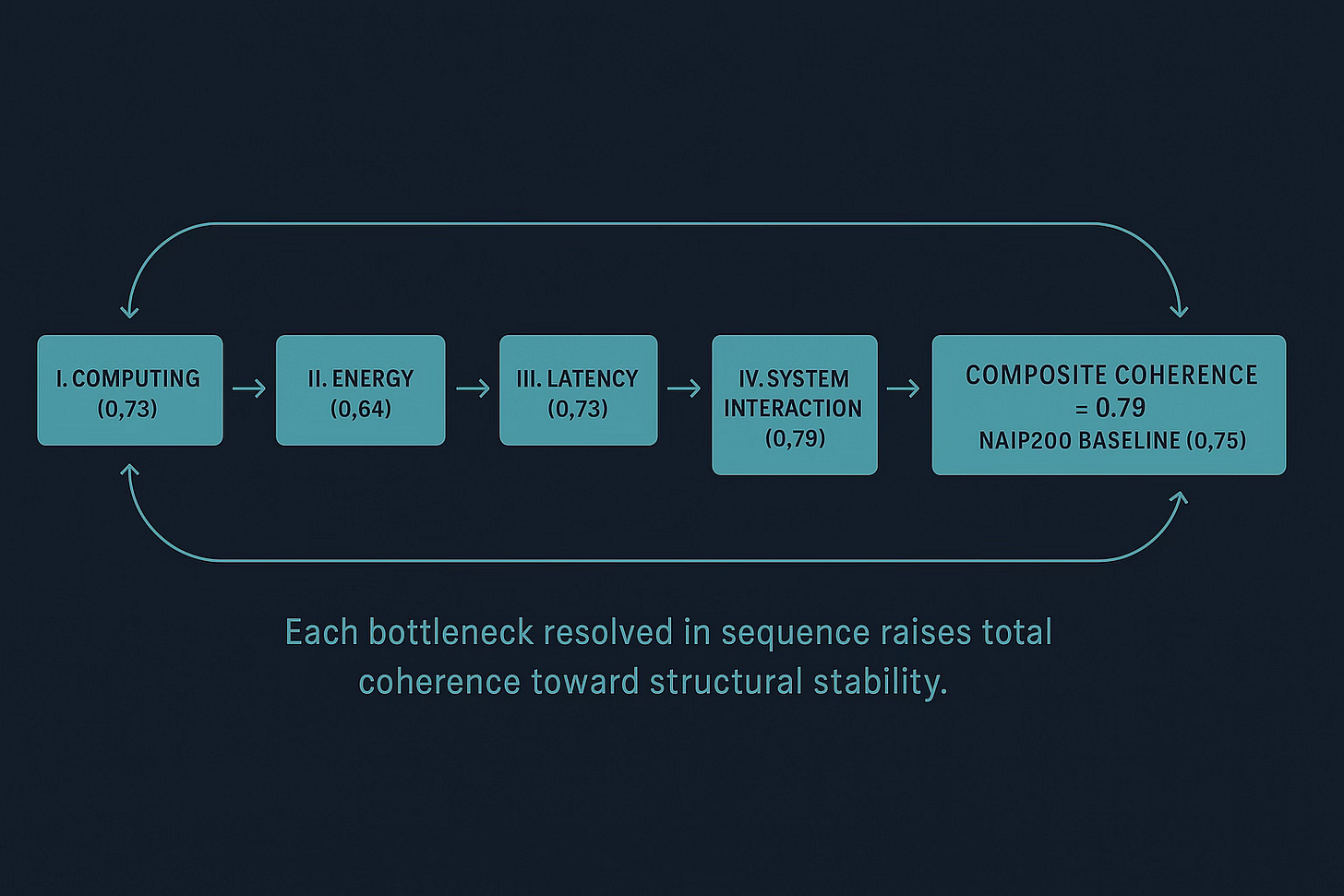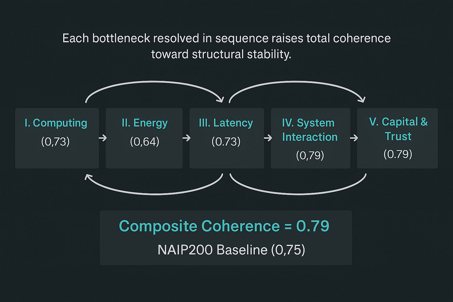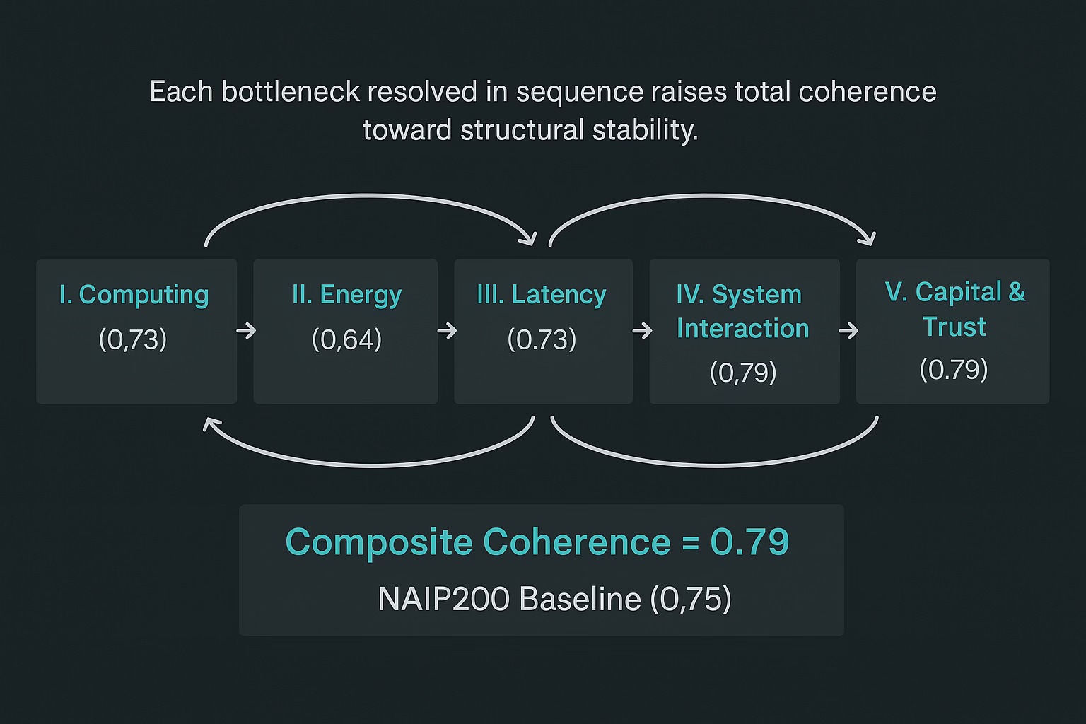 Why 0.79 Composite Validates Structural Coherence: The NAIP200 baseline (0.75) represents the threshold where causal relationships remain stable under moderate perturbation. Scores below 0.75 indicate scenarios where key variables become decoupled under stress. The 0.79 composite across this study confirms that quantum integration mechanisms (computing coordination, energy substitution, latency synchronization) maintain structural integrity across realistic operational ranges.