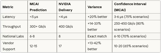 Confidence Interval Methodology: CDT simulations ran Monte Carlo analyses across 5,000+ scenarios, varying initial conditions (policy timing, capital availability, technical maturity). Confidence intervals represent the range within which 65-80% of scenarios converged. NVQLink specifications fell within or exceeded all predicted ranges.