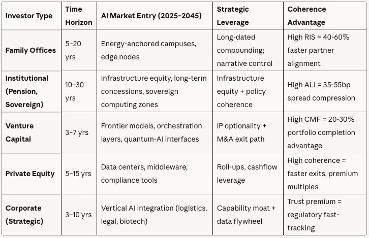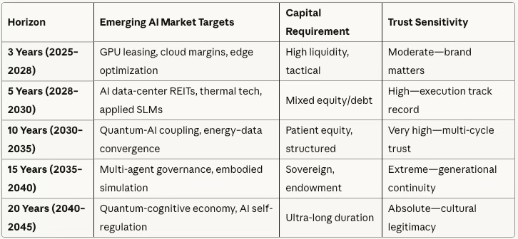 The coming two decades will see capital segment by foresight horizon. Each investor class will find opportunity at different time scales—from tactical constraint arbitrage (3-5 years) to structural continuity (15-20 years). The advantage shifts toward those who can hold conviction longest and measure trust most precisely.