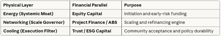 Capital no longer follows projects; projects follow capital architectures that can pass through these three gates. Every mature AI campus now blends them—seed equity, structured debt, and trust-qualified green instruments—sequenced within a single foresight design.