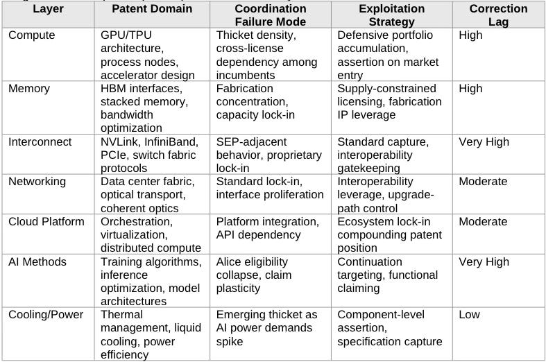 AI Infrastructure Application. AI infrastructure patents operate within a vertically integrated coordination system where focal-point instability at any layer amplifies exploitation incentives at adjacent layers. Compute-layer patent concentration shapes licensing dynamics for every layer above it. Eligibility uncertainty in AI methods patents leaves the innovation layer legally unbounded. The stack is coupled; coordination failure propagates.