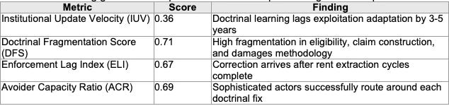 The framework established in Section I and the institutional landscape mapped in Section II converge here. The metrics that follow quantify the core thesis: coordination collapses faster than institutions learn. Low Coase scores confirm coordination failure. High Becker scores confirm rational exploitation. Low Posner scores confirm correction lag. The gap between coordination collapse speed and institutional learning speed is measurable—and large.
