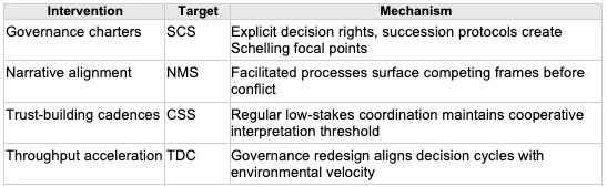 The binding constraint is not transaction cost friction—the binding constraint is coordination architecture. Architecture can be built. The interventions are specific: governance charters that create Schelling focal points, narrative alignment processes that surface competing frames before conflict, trust-building cadences that maintain cooperative interpretation thresholds. Policy implications follow: regulators focused solely on transaction cost reduction address only one dimension of efficiency.