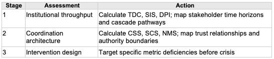 Coordination architecture is infrastructure. Like physical infrastructure, coordination architecture must be built before the architecture is needed. Crisis is too late. The diagnostic protocol and intervention mechanisms provide the blueprint; implementation requires investment before coordination failures materialize.