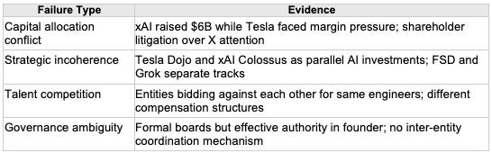 Yet the portfolio exhibits the opposite of Coasean efficiency. xAI raised $6B while Tesla faced margin pressure. Tesla Dojo and xAI Colossus represent parallel AI compute investments with no announced integration. Entities bid against each other for the same engineers. Shareholders have filed derivative litigation alleging attention misallocation. Strategic drift is visible; portfolio coherence is absent.