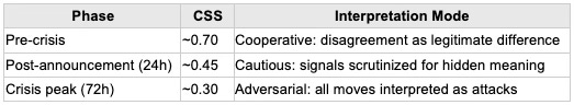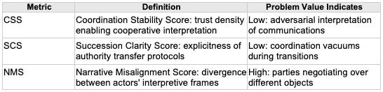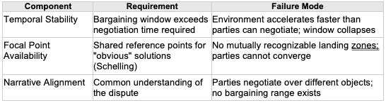 Narrative Alignment: Parties must agree what parties are negotiating about. When organizational identity or strategic frame is contested, no bargaining range exists. Focal Point Availability: Parties need shared reference points—what Schelling called focal points—to converge on “obvious” solutions. Without governance architecture providing reference points, convergence fails even when both parties prefer agreement. Trust Density: Trust determines signal interpretation. High trust means offers are understood as cooperative; low trust means identical signals are read as threats. Below a threshold (~0.40 on the Coordination Stability Score), cooperative bargaining becomes structurally impossible.