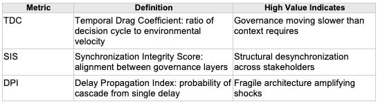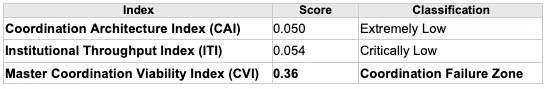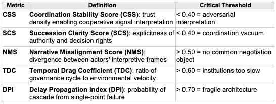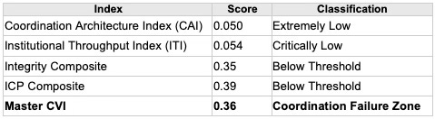 These metrics aggregate with NIBE and SBC indices into a master Coordination Viability Index (CVI) that classifies system state. CVI below 0.40 indicates Coordination Failure Zone; CVI above 0.55 indicates Coordination Viable.