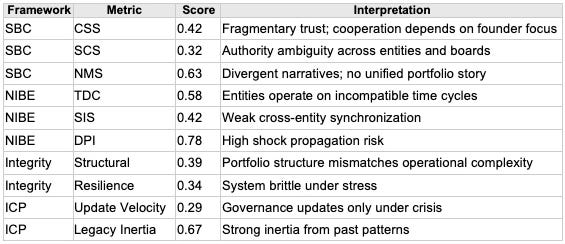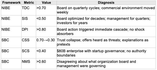 NIBE and SBC metrics explain the failure: CSS collapsed from ~0.70 to ~0.30 within 72 hours, pushing signal interpretation from cooperative to adversarial. SCS was below 0.40—an $80B enterprise operating with startup governance and no succession protocol. NMS exceeded 0.60—board and management were not disagreeing about strategy but about what organization board and management were governing. Transaction costs were zero; coordination costs were catastrophic.
