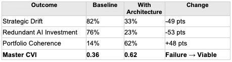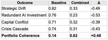 Strategic drift drops from 82% to 33%; portfolio coherence rises from 14% to 62%. The system becomes viable.