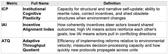 Beyond the core NIBE and SBC metrics, CDT simulation employs three supplementary indices that capture institutional adaptability and incentive coherence: