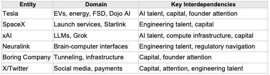 Elon Musk controls six major entities with overlapping strategic interests, shared talent pools, and competing capital requirements. The Musk portfolio creates a natural experiment in multi-entity coordination.
