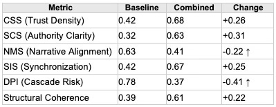 The combined intervention moves every metric above threshold, shifting the system from Coordination Failure Zone to Coordination Viable.