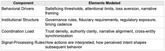 Game-theoretic structure enters where game theory clarifies interdependence—how one actor’s move reshapes another actor’s feasible choices—but behavioral economics remains the central engine. CDT methodology captures how coordination frictions, narrative divergence, and timing mismatches alter strategic behavior long before formal incentives break down.