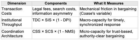 The extended theorem: Parties will bargain to efficient outcomes when transaction costs are low, institutional throughput is adequate, and coordination architecture is robust. Failure in any dimension blocks the Coasean mechanism. The extended formula is not merely conceptual—the formula is measurable through CDT simulation.