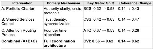 The baseline is not destiny. CDT simulation of three intervention scenarios—portfolio charter, shared services council, and founder attention routing protocol—demonstrates that coordination architecture investments produce measurable improvement: