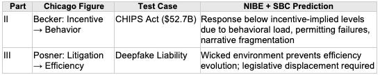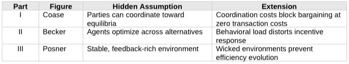 The unified argument across three parts: Chicago law and economics correctly identified that incentive structure determines outcomes. NIBE and SBC specify when incentive structure actually translates to behavior—and when coordination costs, behavioral load, or environmental wickedness intervene. Together, Parts I through III complete the Chicago School by specifying boundary conditions.