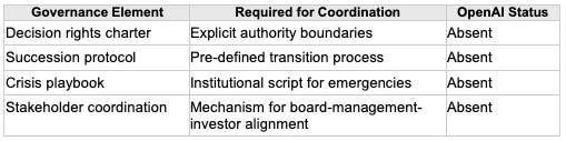 Even parties who want to coordinate need shared reference points—what Schelling called “focal points.” Organizations build focal points through governance architecture. OpenAI had not built governance architecture.