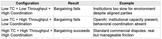 Insight: Coasean efficiency requires all three dimensions; most bargaining succeeds because coordination architecture compensates for transaction costs.
