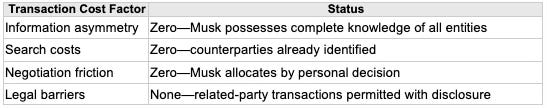 Ronald Coase won the Nobel Prize for demonstrating that private parties bargain to efficient outcomes when transaction costs are low. Coase, Ronald H., The Problem of Social Cost, Journal of Law and Economics, Vol. 3 (October 1960). For sixty years, Coase’s theorem has anchored law and economics: reduce friction—legal fees, search costs, information asymmetries—and efficient allocation follows. The theorem predicts that Elon Musk’s six-entity portfolio should be a model of resource optimization. Tesla, SpaceX, xAI, Neuralink, Boring Company, and X/Twitter share a single controlling decision-maker with complete information across all entities. Transaction costs are zero: Musk allocates capital, talent, and attention by personal decision with no search costs, no information asymmetry, and no legal barriers to related-party coordination.