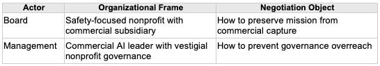 Board and management positions were not positions on a shared continuum—board and management held competing definitions of what OpenAI was. No bargaining range exists when parties disagree about the object of negotiation.