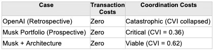 Part I has demonstrated a single core proposition: transaction costs and coordination costs are analytically distinct. Zero transaction costs do not guarantee efficient outcomes when coordination architecture is absent. The proposition has been validated retrospectively (OpenAI) and tested prospectively (Musk ecosystem) with registered, falsifiable predictions.