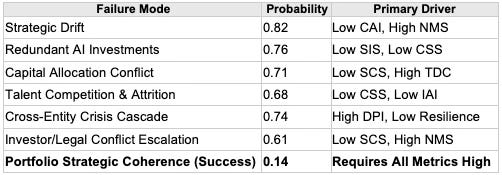 Baseline failure probabilities derived from CDT simulation: Strategic Drift 82%, Redundant AI Investment 76%, Crisis Cascade 74%, Capital Allocation Conflict 71%, Portfolio Coherence (Success) 14%.