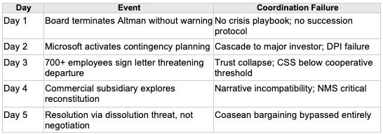 Theory requires empirical validation. The OpenAI governance crisis of November 2023 provides a natural experiment: a high-stakes negotiation where transaction costs approached zero but coordination failed catastrophically. The OpenAI case demonstrates that coordination costs are not merely theoretical—coordination costs produce observable, measurable dysfunction.