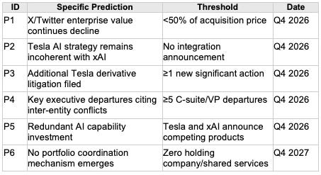 Six specific predictions are registered for validation by Q4 2027, including: X/Twitter enterprise value below 50% of acquisition price; no Tesla-xAI integration announcement; additional derivative litigation; five or more C-suite departures citing inter-entity conflicts. Falsification criteria are explicit: if four or more predictions fail to materialize, Coasean logic is validated for complex multi-entity structures.