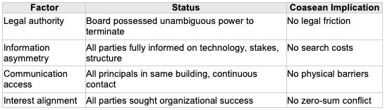 By Coase’s specified criteria, OpenAI should have been an easy case. All barriers to efficient negotiation were absent.