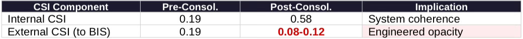 Causal Signal Integrity Paradox: Internal coherence rises dramatically (0.19→0.58) as consolidated operators align objectives. But external-facing traceability falls (toward U.S. regulators) to 0.08-0.12 as sophisticated actors construct deliberate opacity layers. The chaotic buildout was transparent in its dysfunction; consolidated operators will be opaque by design.