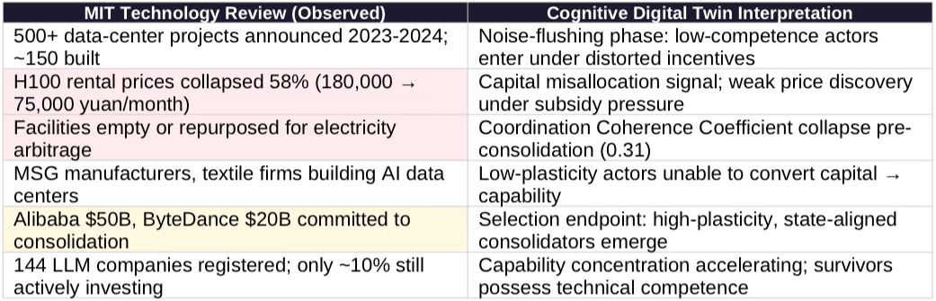 MIT Technology Review reporting documents a coordination failure that, paradoxically, accelerates the strategic threat. China’s chaotic data center buildout was inefficient at converting capital into capability—capital destruction exceeded capability formation. The consolidation now underway will prove efficient—state-coordinated, technically competent, strategically focused.
