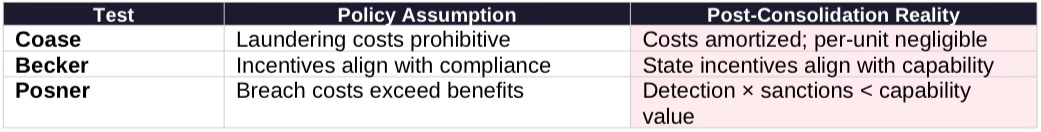 Coase Test (Transaction Costs): Policy assumes laundering costs exceed benefits. Reality: consolidated entities amortize compliance architecture across massive portfolios, reducing per-transaction cost to near-zero. FAILED.