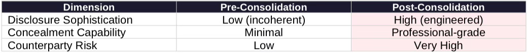 Causal Signal Integrity Assessment: Pre-consolidation ecosystem proved detectable because incoherence made violations visible. Post-consolidation entities operate with high internal coherence and deliberate external opacity—the worst combination for enforcement.