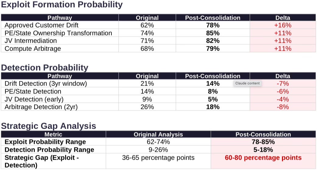 Prior analysis modeled four exploit pathways operating independently. Consolidation creates pathway convergence—each mechanism now reinforces the others through shared infrastructure, transforming isolated vulnerabilities into systemic failure.