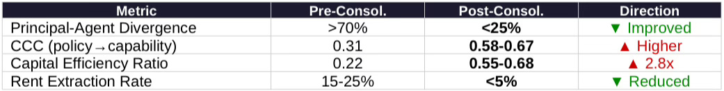 Pre-consolidation: Principal-agent misalignment severe (>70% divergence). Local officials optimized for visible projects, not capability. Middlemen extracted 15-25% through subsidy capture. CCC collapsed to 0.31. Capital Efficiency Ratio: 0.22—for every yuan invested, only ¥0.22 converted to deployable AI capability.