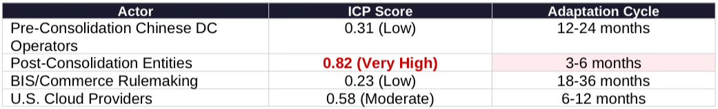 Adaptation Asymmetry: Pre-consolidation operators (plasticity 0.31) adapted slowly—local governments locked into real estate patterns, textile firms lacked AI infrastructure cognition. Post-consolidation entities (plasticity 0.82) are technology companies optimized for rapid strategic pivots. Bureau of Industry and Security rulemaking (plasticity 0.23) runs 18-36 months; consolidated operators restructure compliance in 3-6 months.