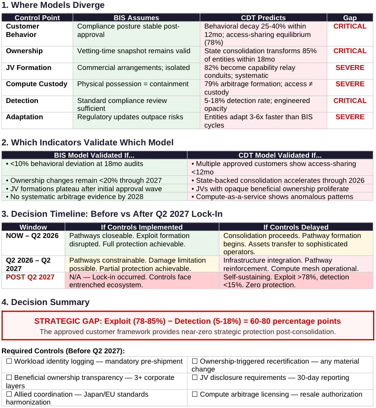 H200 ‘approved customer’ framework proved inadequate before consolidation. After consolidation, it becomes actively dangerous—a credentialing system that legitimizes capability transfer to state-coordinated entities operating sophisticated compliance theater. Four exploit pathways identified in prior analysis now operate as a reinforcing system through shared consolidated infrastructure.