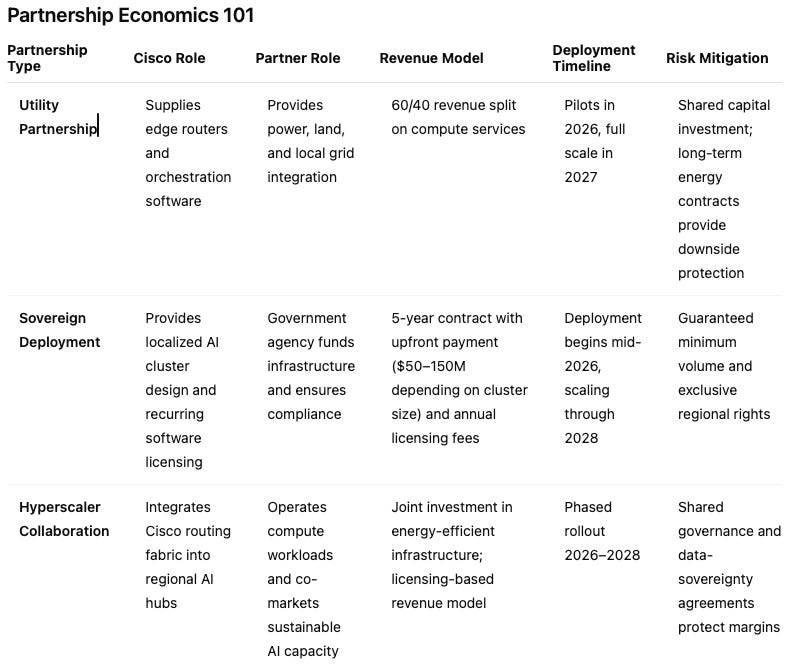 The next trillion-dollar AI alliances will revolve around power-network partnerships. Cisco’s architecture connects energy developers, governments, and clouds in shared value creation. Hyperscalers extend Cisco’s market reach, utilities deliver energy resilience and recurring revenue, and sovereign clients secure trust and regulatory continuity. Together they form a network of stability, scale, and policy legitimacy that compounds returns for Cisco and investors.