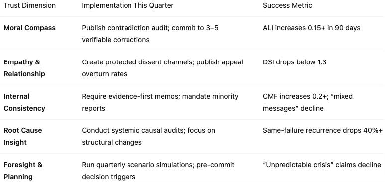 For Institutional Leaders: Audit contradiction gaps between stated values and behavior. Measure dissent costs and align internal and external communications. Create dissent channels, run contradiction audits, and adopt evidence-first protocols.