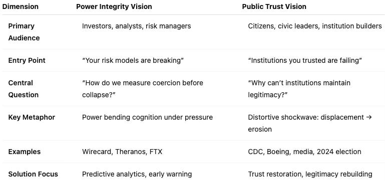 Together: You understand when coercion starts (Power Integrity detection) AND where it leads if unaddressed (Public Trust progression). You can prevent trust collapse AND recover from it.