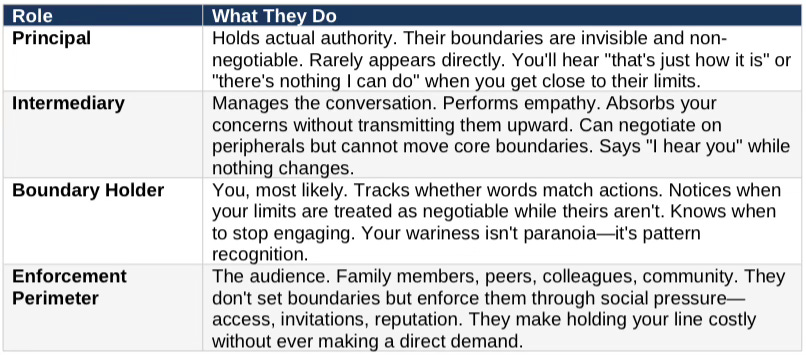 Before measuring boundary asymmetry, you need to map the players. Every asymmetric boundary negotiation involves four positions. Understanding which role you occupy—and which roles others occupy—clarifies why certain conversations feel impossible and what’s structurally happening beneath the surface.