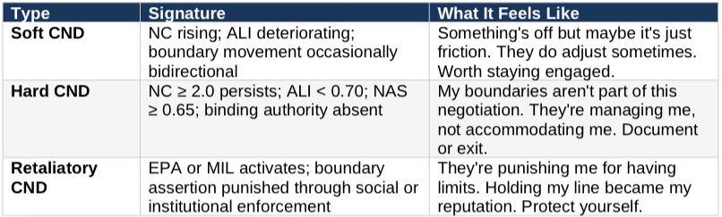 The preceding sections described the mechanics of boundary asymmetry—roles, metrics, triggers, domain patterns, and the boundary holder’s trajectory. Section VII pulls these together into a classification system. The simulation classifies asymmetric boundary negotiation into three types based on severity and mechanism. Understanding the type clarifies what’s structurally happening—and what responses remain possible.