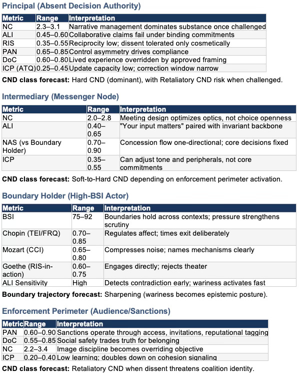 Simulation finding: NC ≥ 2.0 indicates narrative management dominates substance. In boundary erosion scenarios, we see NC ranges of 2.0–3.4 across parties. The institution’s real project has become perception management—attendance numbers, quote harvesting, and legitimacy optics.