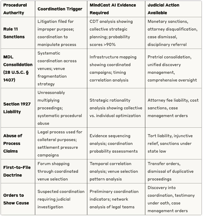 Judicial enforcement mechanisms enable courts to address coordination comprehensively rather than attempting to detect coordination patterns across multiple separate proceedings using traditional case-by-case analysis. MindCast AI's intelligence supports these judicial actions by providing measurable evidence of coordination that meets established legal standards for procedural sanctions.