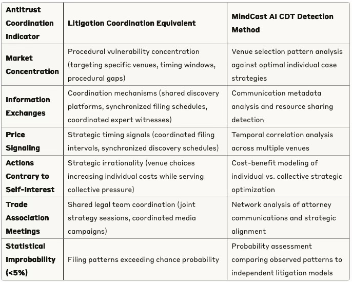 The direct application of antitrust coordination detection principles to litigation contexts provides courts with systematic frameworks for identifying coordination signatures across multiple venues and parties using established legal methodology. MindCast AI's CDT foresight simulations enable courts to apply traditional antitrust plus factors analysis with unprecedented accuracy by modeling the decision-making environments that produce coordination versus independent action.