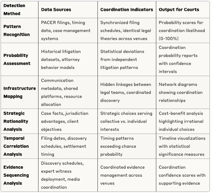 AI systems provide courts with unprecedented capability to identify and quantify litigation coordination patterns that traditional case-by-case analysis cannot detect effectively, enabling real-time coordination detection across multiple venues and parties simultaneously. Machine learning algorithms can analyze vast datasets of litigation patterns, timing distributions, strategic decision sequences, and behavioral signatures to establish baseline expectations for independent litigation behavior and identify systematic deviations that suggest coordinated strategic planning.