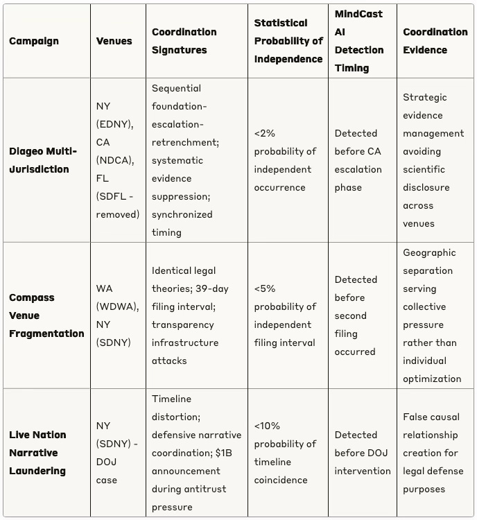 Recent documented litigation coordination campaigns provide concrete validation of antitrust framework applicability to systematic multi-venue litigation strategies, demonstrating how courts can apply established coordination detection tools to identify and address procedural manipulation campaigns that exploit judicial system vulnerabilities. The Diageo multi-jurisdictional pattern and Compass venue fragmentation strategy exhibit classic coordination signatures identifiable through plus factors analysis, statistical improbability assessment, and economic irrationality examination using established antitrust methodology.