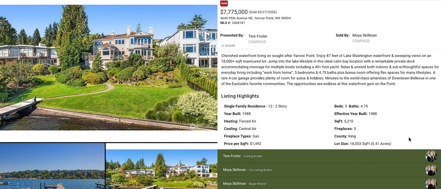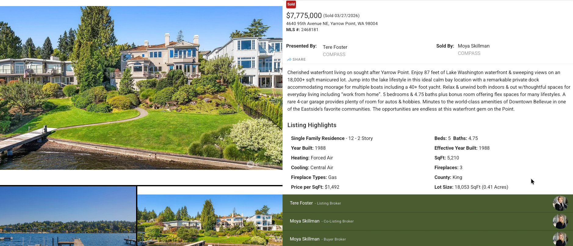 [IMAGE: NWMLS Listing #2468181 — 4640 95th Avenue NE, Yarrow Point, WA 98004, sold March 27, 2026 at $7,775,000. Three-line broker assignment: Tere Foster (Listing Broker), Compass; Moya Skillman (Co-Listing Broker), Compass; Moya Skillman (Buyer Broker), Compass. Screenshot captured April 17, 2026.]