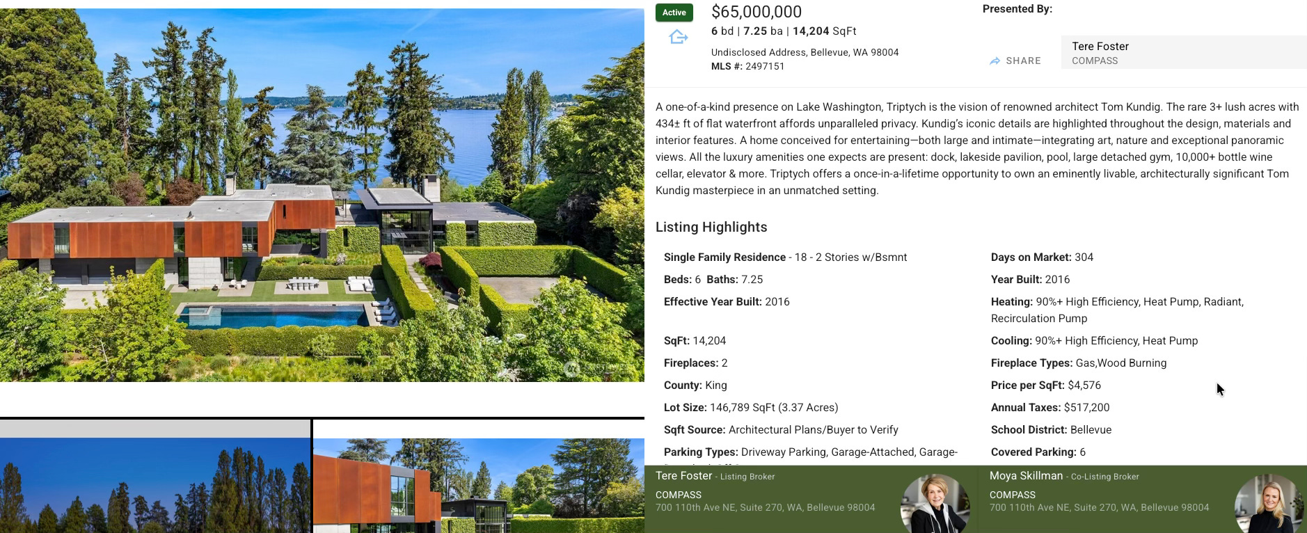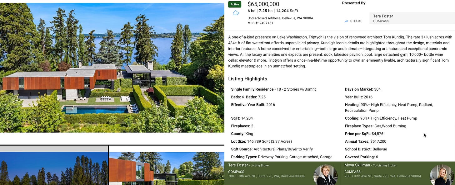 NWMLS listing 2497151 is currently active at $65,000,000 for “Triptych” — a Tom Kundig-designed Lake Washington estate presented as “Undisclosed Address, Bellevue, WA 98004” with 304 days on market. Tere Foster is the Listing Broker. Moya Skillman is the Co-Listing Broker. The listing’s current-state MLS page documents the Gate 1 address-suppression mechanism operating on the publicly accessible NWMLS system.