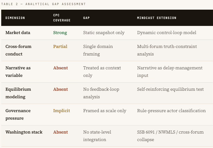 MindCast builds on that foundation. The extension demonstrates that the report captures only one layer of a larger system. The observed increase in local concentration and in-house deal capture represents the visible output of a broader control architecture operating across listings, referrals, portals, litigation, messaging, and market governance. The Washington stack — SSB 6091, NWMLS, cross-forum position tension — adds the state-level dimension the national frame leaves open. The distinction between lawful scale and governance-distorting scale adds the structural dimension that standard consumer-protection analysis is not designed to reach.